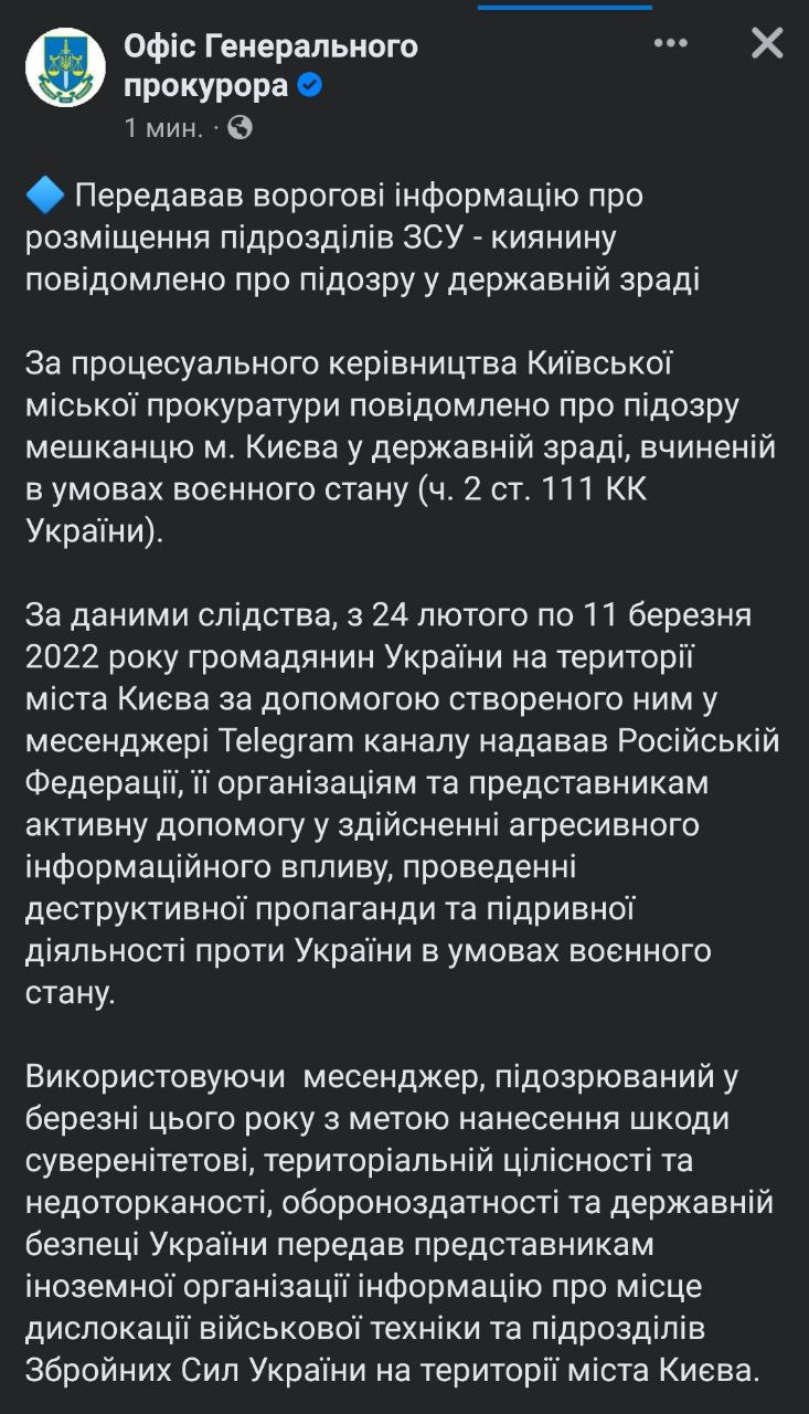 19.50 Жителя Киева обвинили в госизмене за создание телеграм-канала, в котором он публиковал места дислокации украинских войск и проводил "деструктивную пропаганду".