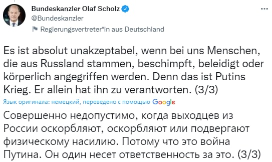 "Совершенно недопустимо, когда выходцев из России оскорбляют, оскорбляют или подвергают физическому насилию. Потому что это война Путина. Он один несет ответственность за это", - написал Шольц в Твиттер.