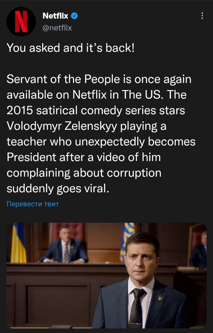 Netflix вернул в эфир сериал "Слуга народа" с Зеленским в главной роли. Покажут его для американских пользователей.