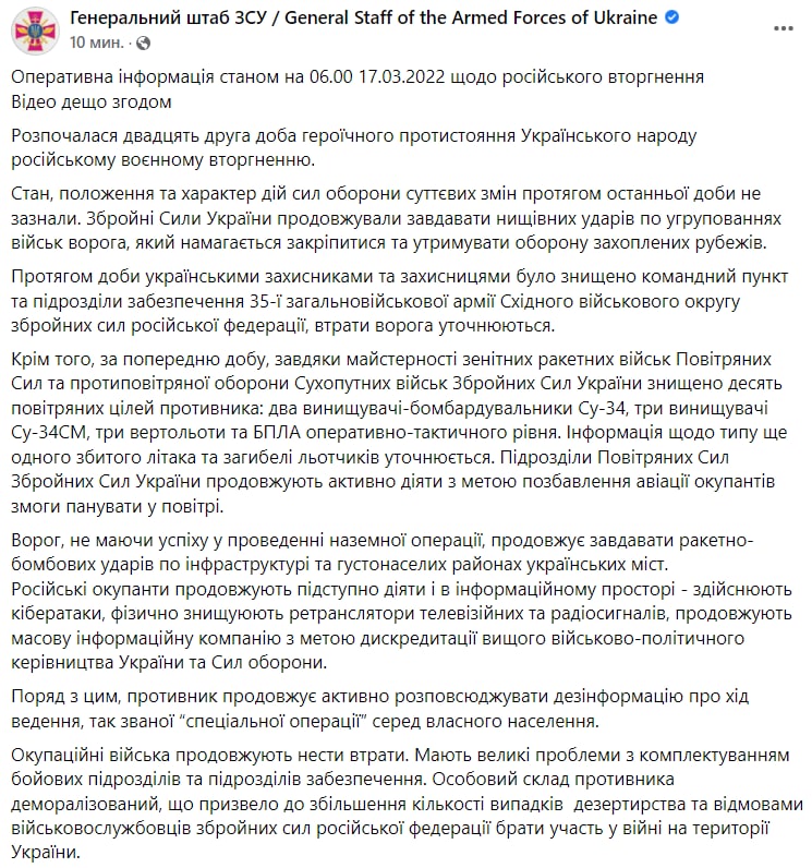 20.50 Подвели главные итоги 22-го дня войны в Украине.
