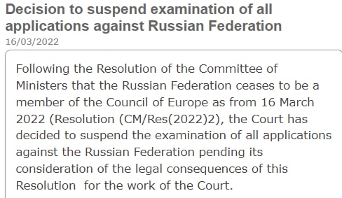 07.41 Из-за того, что Россия вышла из Совета Европы, Европейский суд по правам человека прекращает рассмотрение всех исков против РФ.