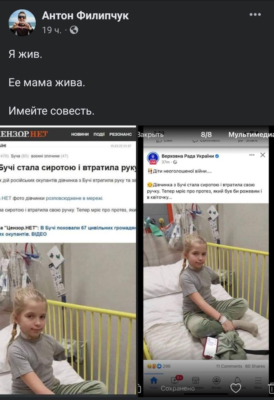08.08 Вчера в Сети многие сообщили о девочке из Бучи, которая потеряла руку и осталась сиротой из-за войны. Об этом сообщали экс-нардеп Сергей Лещенко, аккаунт Верховной Рады и ряд СМИ.