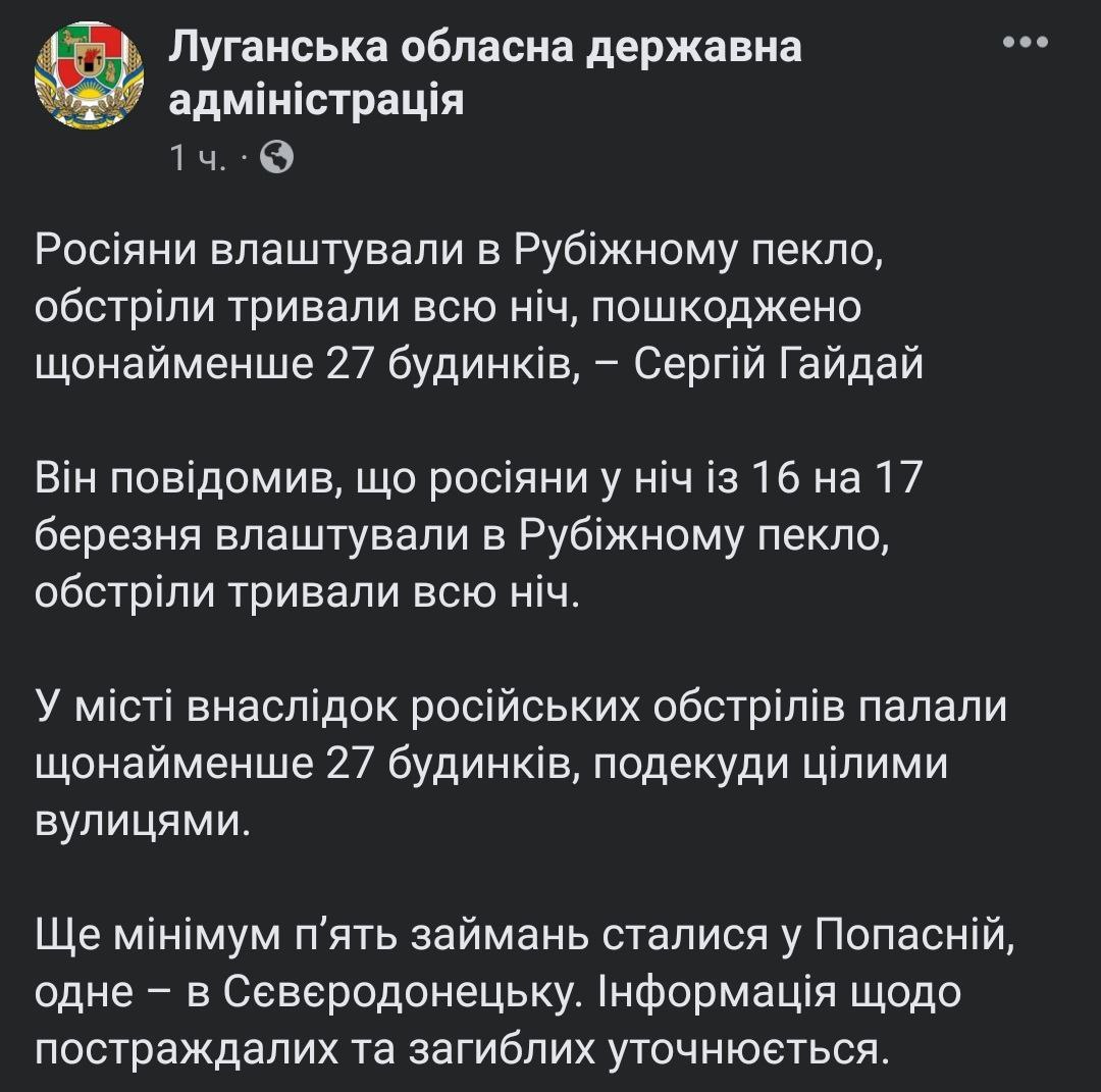 08.45 Сегодня ночью в Рубежном под российский огонь попало 27 жилых домов, рассказал губернатор Луганщины Сергей Гайдай. Ещё пять домов загорелись в Попасной и один - в Северодонецке.