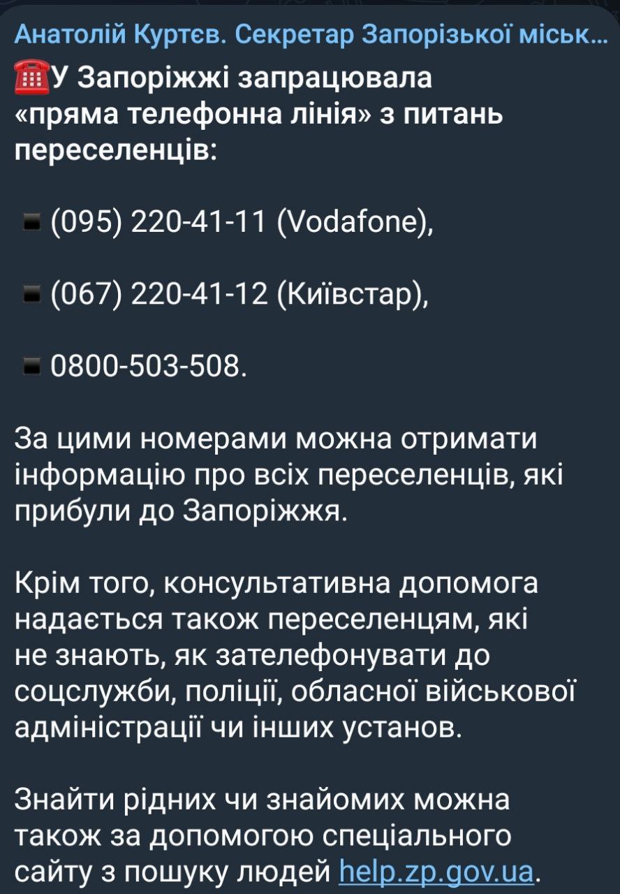 08.49 В Запорожье сейчас тысячами стекаются беженцы из Мариуполя. Местные власти публикуют телефоны, по которым люди могут обращаться за помощью.