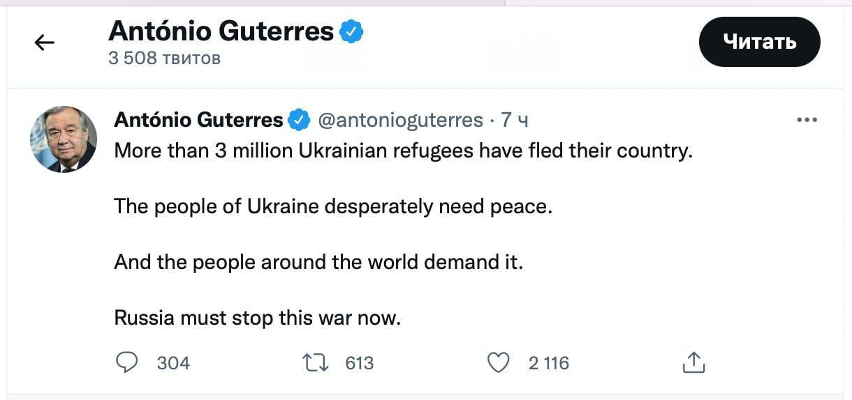 08.51 Уже более 3 миллионов украинцев покинули свою страну из-за войны, написал генеральный секретарь ООН Антониу Гутерриш.