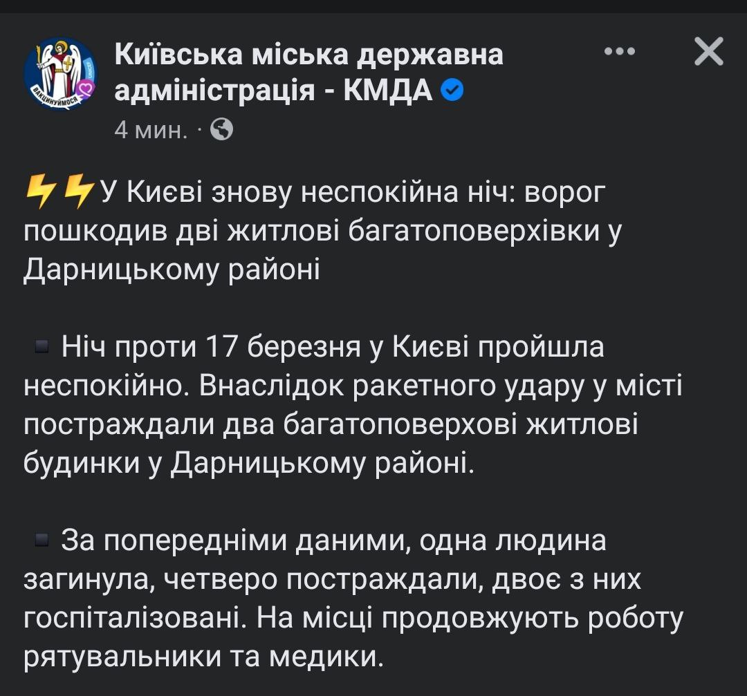 09.16 Мэрия Киева сообщила, что сегодня ночью под обстрел попали два дома в Дарницком районе.