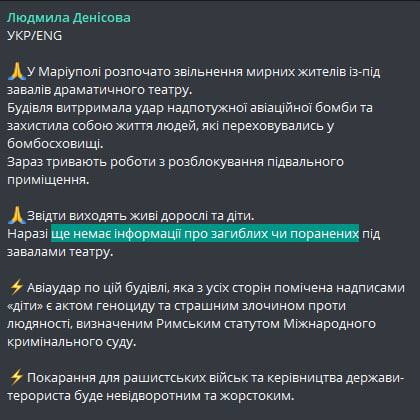 10.13 Нардеп Сергей Тарута сообщил что бомбоубежище под Драматическим театром в Мариуполе выдержало авиаудар, люди живы, а завалы начали разбирать.