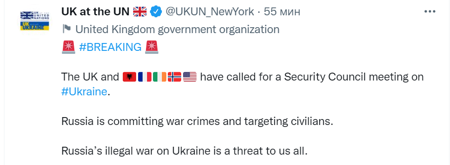 "Великобритания, Албания, Ирландия, Норвегия, США и Франция запросили заседание Совета Безопасности ООН по Украине", - отмечается в тексте. Дата и время заседания не уточняются.