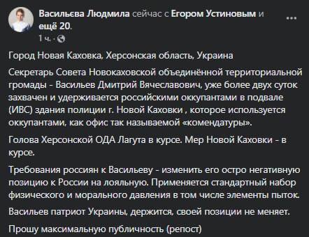 Секретарь горсовета Новой Каховки Дмитрий Васильев похищено россиянами и уже более двух суток удерживается в подвале захваченного здания полиции города.
