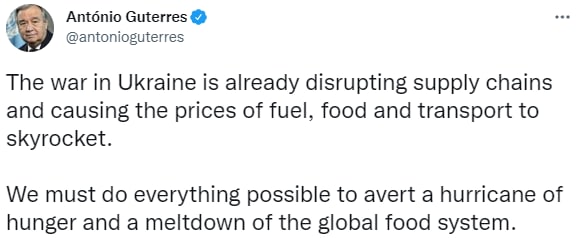 "Война в Украине уже нарушает цепочки поставок и вызывает стремительный рост цен на топливо, продукты питания и транспорт. Мы должны сделать все возможное, чтобы предотвратить ураган голода и крах глобальной продовольственной системы", - написал Антонио Гуттериш.