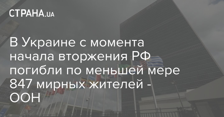 Управление комиссара Организации Объединенных Наций по правам человека сообщило, что в Украине с момента начала вторжения РФ погибли по меньшей мере 847 мирных жителей (в том числе 64 ребенка) и еще 1399 человека пострадали (в том числе 78 детей). Из них 240 погибших и 728 пострадавших - на Донбассе.