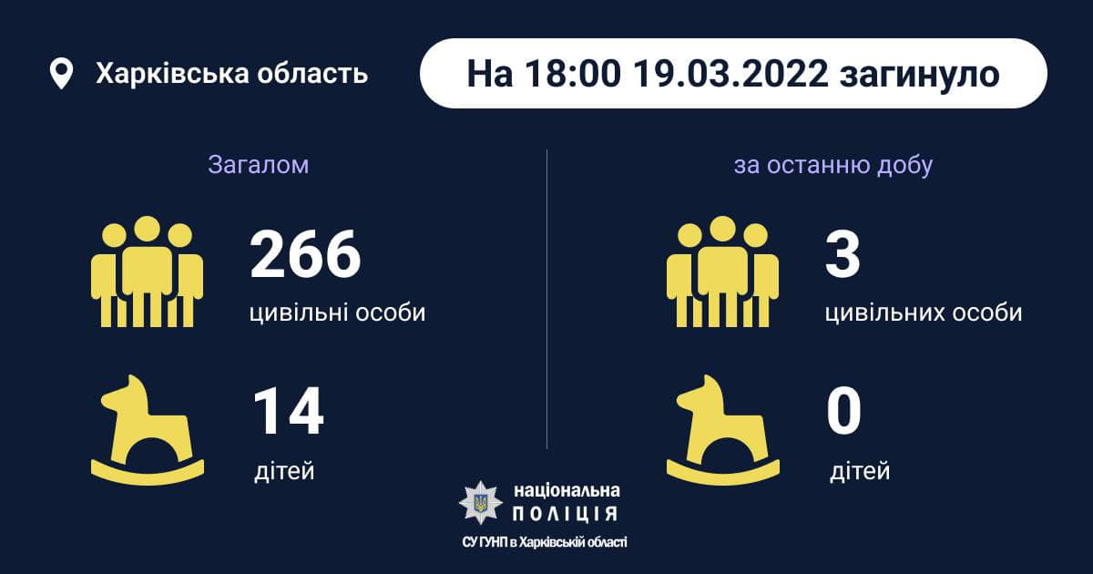 По состоянию на 18:00 19 марта в Харьковской области насчитали 266 жертв среди гражданских, за последние сутки погибли три человека.