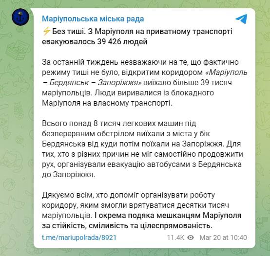 "За последнюю неделю, несмотря на то, что фактически режима тишины не было, по открытому коридору "Мариуполь – Бердянск – Запорожье" выехало более 39 тысяч мариупольцев. Люди вырывались из блокадного Мариуполя на собственном транспорте", - сообщает горсовет в Telegram-канале.