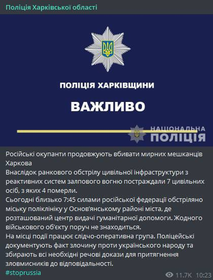 "Российские оккупанты продолжают убивать мирных жителей Харькова. В результате утреннего обстрела гражданской инфраструктуры из реактивных систем залпового огня пострадали 7 гражданских лиц, из которых 4 умерли. Сегодня около 7:45 силами Российской Федерации обстреляна городская поликлиника в Основянском районе города, где расположен центр выдачи гуманитарной помощи. Ни одного военного объекта рядом не находится", - говорится в сообщении.