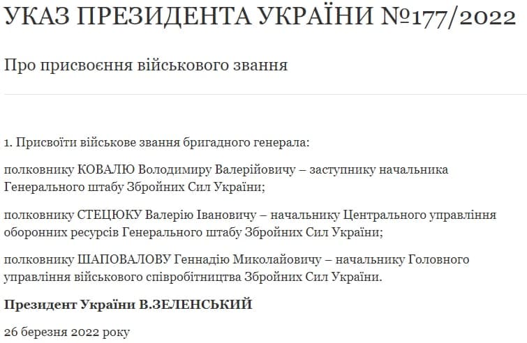 Как говорится в указе, звание бригадного генерала присваивается офицерам Генерального штаба Владимиру Ковалю, Валерию Стецюку и Геннадию Шаповалову.