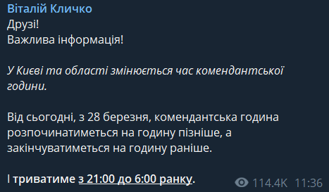 "Друзья! Важная информация! В Киеве и области меняется время комендантского часа. С сегодняшнего дня, с 28 марта, комендантский час будет начинаться на час позже, а заканчиваться на час раньше. И продлится с 21:00 до 6:00 утра", - написал Кличко.
