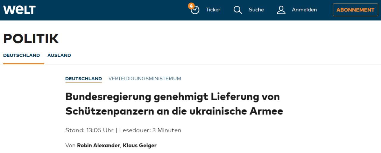 Федеральное правительство Германии одобрило поставку бронетранспортеров украинской армии. Об этом сообщает Welt am Sontag