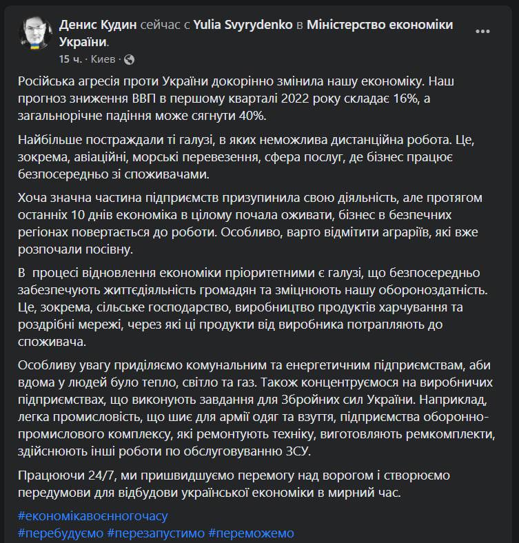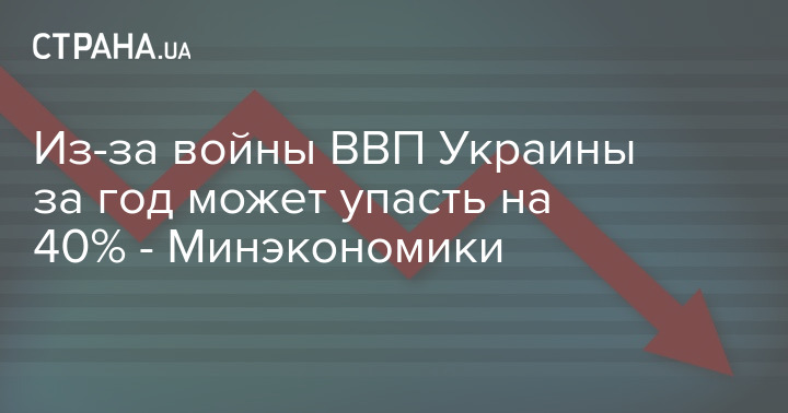 Первый заместитель министра экономики Украины Денис Кудин утверждает, что из-за войны ВВП в стране может упасть на 16% в первом квартале этого года. Падение в целом за год может достигнуть 40%.