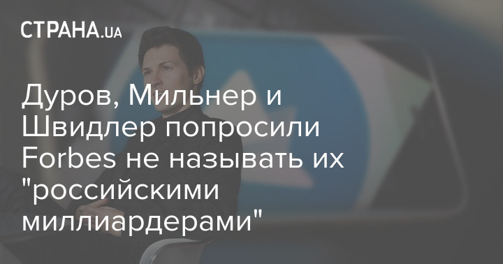 Журнал Forbes пишет, что ряд бизнесменов, которые родились и выросли в России, на фоне санкций попросили издание не называть их "российскими миллиардерами". В их числе — Павел Дуров, Юрий Мильнер, Евгений Швидлер.