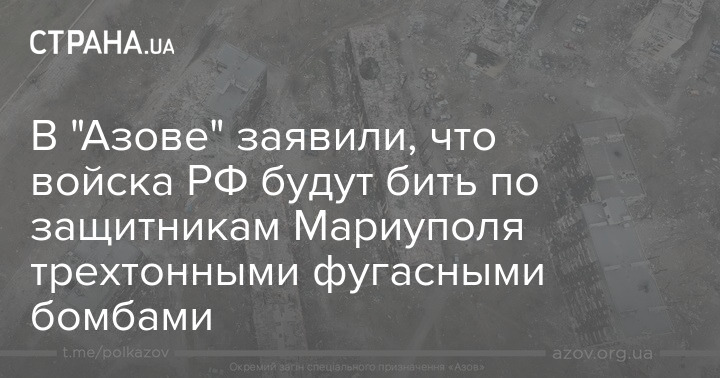 Представитель полка "Азов" Владислав Соболевский заявил, что военные полка, которые закрепились в Мариуполе на "Азовстали", ожидают, что по ним россияне будут бить тяжёлыми фугасными бомбами, сбрасываясь их со стратегических бомбардировщиков.
