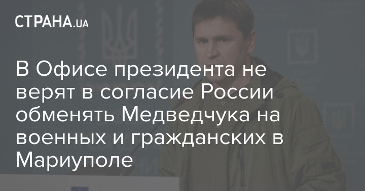 "Сомневаюсь, что сами россияне, просто упивающиеся кровью мариупольцев и азовцев, захотят вернуться на время в человеческий образ и всерьез поддержать инициативу Медведчука", - заявил Подоляк.