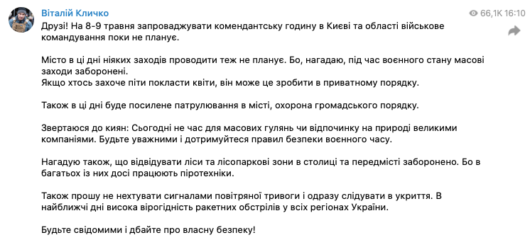Он напомним, что в Киеве запрещено посещать леса и лесопарковые зоны и призвал в случае воздушной тревоги следовать в укрытие.