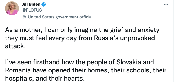 "Вместе мы едины для Украины. Надеюсь, находясь здесь, я смогу передать миру, насколько их сила и стойкость вдохновляют мир, и напомнить им, что они не одиноки", - написала супруга Байдена.