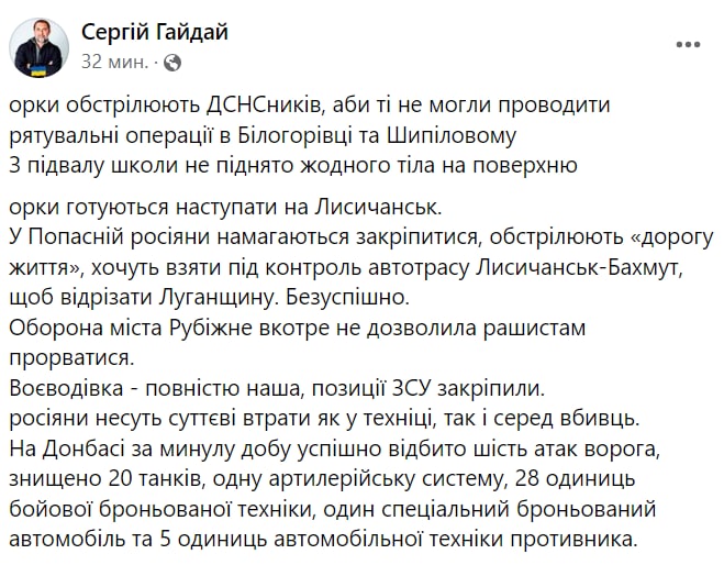 "Эвакуации из Луганщины сегодня не будет! Россияне начали обстреливать "дорогу жизни" трассу Лисичанск-Бахмут, поэтому проезд опасен. Гумгрузы тоже сегодня не будут завозить, мы заранее позаботились, чтобы оставшиеся имели все необходимое", - заявил он.