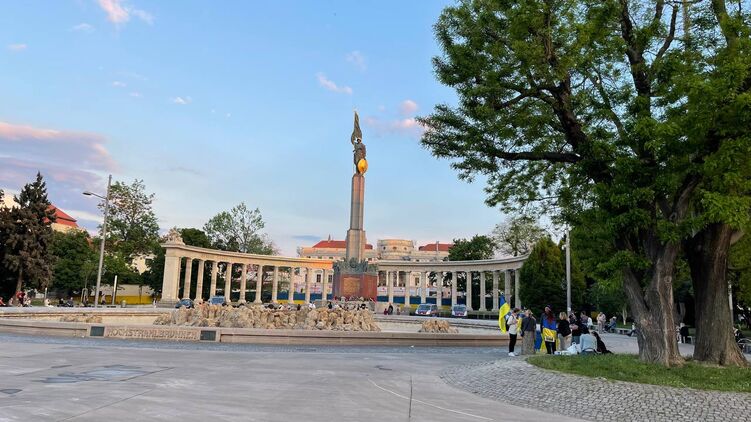 Между тем мемориал советским воинам в Вене находится под усиленной охраной полиции. Рядом расположена группа людей с украинским флагом.