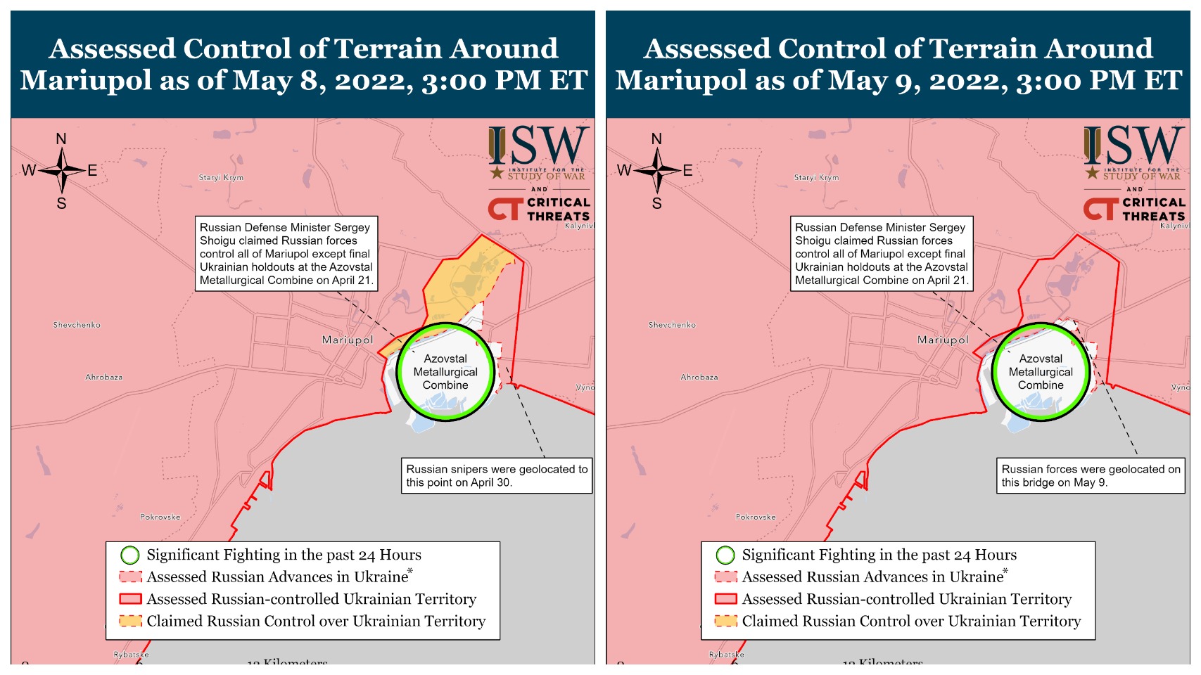Если сравнить военные карты за 8 и 9 мая, составленные Институтом изучения войны (США), то мы увидим, что между Лиманом и Северодонецком Россия за прошедшие сутки расширила зону контроля в треугольнике Ямполь - Кременная - Белогоровка.
