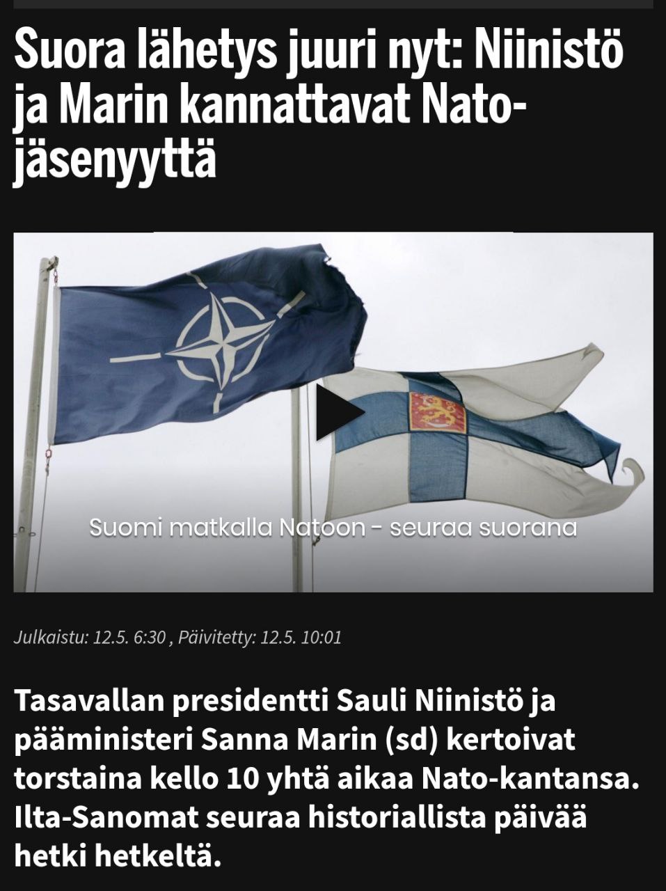 10:11 Финляндия официально подала заявку на вступление в НАТО, пишут местные СМИ.