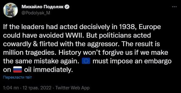 6. "Благодарен премьеру Нидерландов за сегодняшее обращение к Верховной Раде Украины. Это важный шаг. Но еще важнее то, что Нидерланды "адвокатируют" отказ от российской нефти и готовы реализовать это без проволочек".