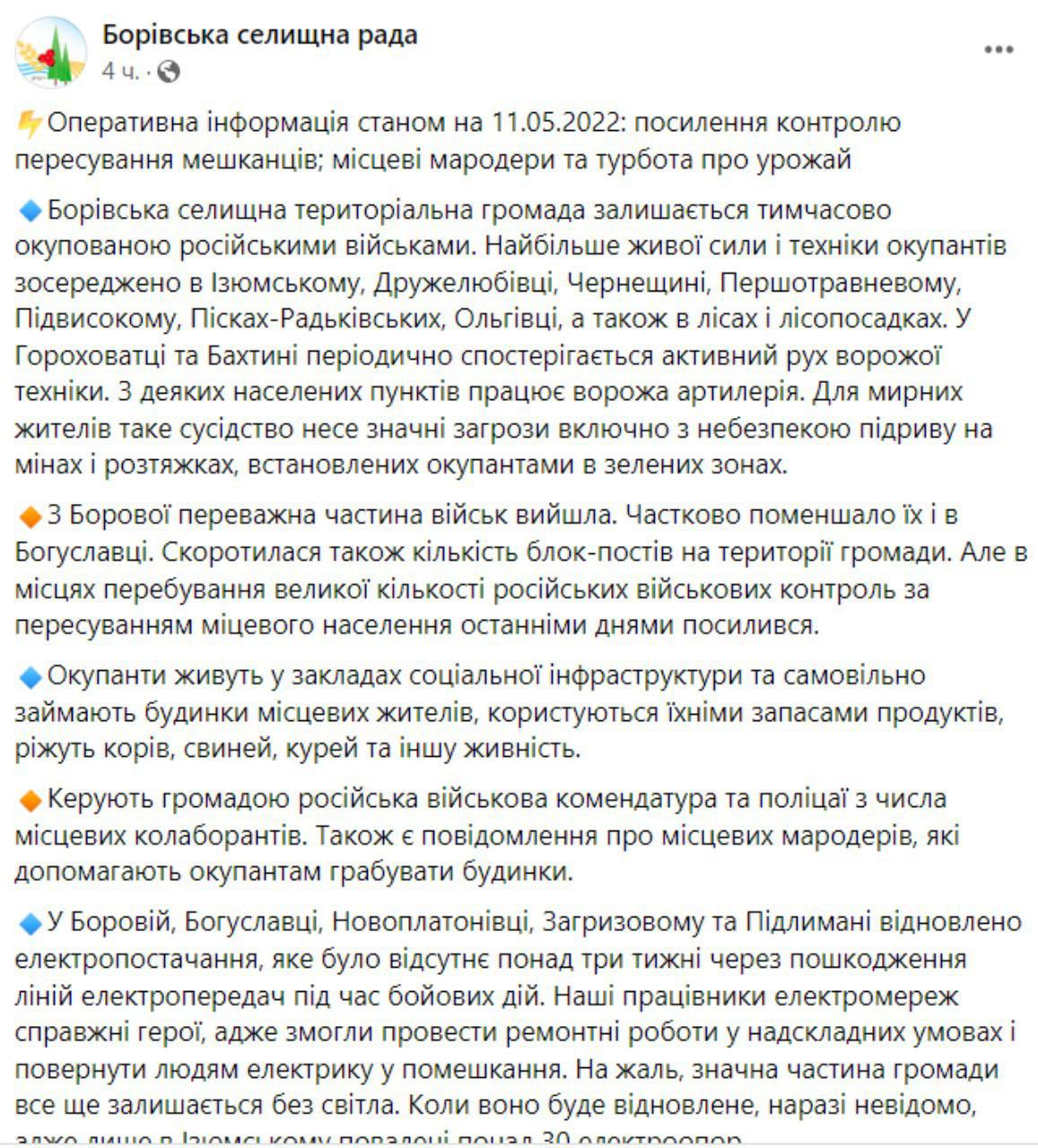 Также сельсовет сообщил, что в Боровой, Богуславке, Новоплатоновке, Загрызовом и Подлимане восстановлено электроснабжение, которое отсутствовало более трех недель из-за повреждений линий электропередач во время боевых действий.