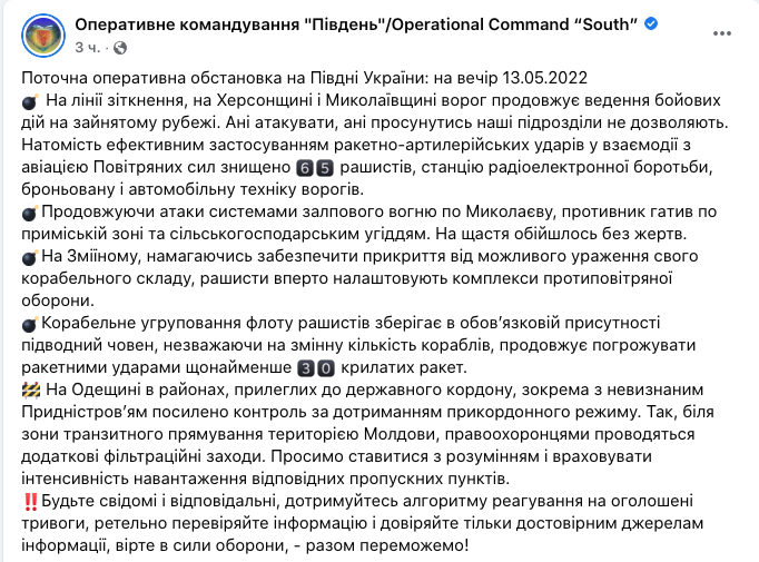 А на границе Николаевской и Херсонской областей ракетно-артиллерийские удары и авиация уничтожили 65 россиян, станцию радиоэлектронной борьбы, бронированную и автомобильную технику РФ.