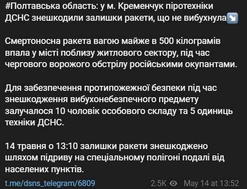 "Смертоносная ракета весом почти в 500 килограммов упала в городе близ жилого сектора, во время очередного вражеского обстрела российскими оккупантами. Для обеспечения противопожарной безопасности при обезвреживании взрывоопасного предмета привлекались 10 человек личного состава и 5 единиц техники ГСЧС. 14 мая в 13:10 остатки ракеты обезврежены путем подрыва на специальном полигоне вдали от населенных пунктов", - говорится в сообщении ГСЧС.