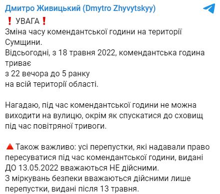 "Также важно: все пропуска, которые предоставляли право передвигаться во время комендантского часа, выданные до 13.05.2022, считаются недействительными. Из соображений безопасности считаются действительными только пропуска, изданные после 13 мая", - подчеркнул Живицкий.