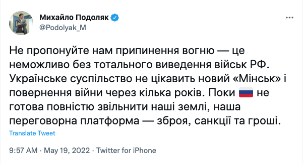 "Не предлагайте нам прекращение огня – это невозможно без тотального вывода войск РФ. Украинское общество не интересует новый "Минск" и возвращение войны через несколько лет. Пока Россия не готова полностью освбодить наши земли, наша переговорная платформа — оружие, санкции и деньги", - написал Подоляк в Twitter.