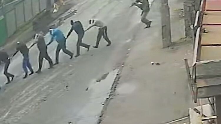 Газета приводит видео с камер наблюдения за 4 марта, где видно, как двое с автоматами в российской форме ведут девять украинских пленных. Среди них выделяется мужчина в ярко-синей кофте.