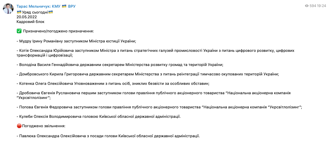 По его информации, соответствующие кадровые перестановки утвердило правительство.