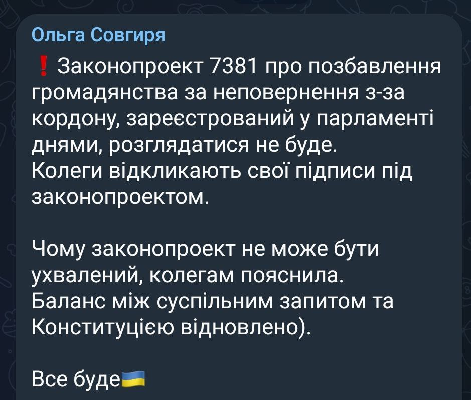 Вчера подпись отозвала соавтор Марьяна Безуглая. А сегодня нардеп Ольга Совгиря заявила, что это сделали и другие авторы.