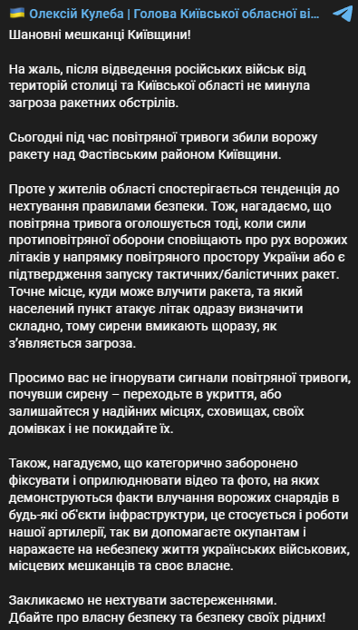 "К сожалению, после отвода российских войск от территорий столицы и Киевской области не прошла угроза ракетных обстрелов. Сегодня во время воздушной тревоги сбили вражескую ракету над Фастовским районом Киевщины. Однако у жителей области наблюдается тенденция к пренебрежению правилами безопасности. Напомним, что воздушная тревога объявляется тогда, когда силы противовоздушной обороны извещают о движении вражеских самолетов в направлении воздушного пространства Украины или есть подтверждение запуска тактических/баллистических ракет. Точное место, куда может попасть ракета, и какой населенный пункт атакует самолет, сразу определить сложно, поэтому сирены включают каждый раз, как появляется угроза. Просим вас не игнорировать сигналы воздушной тревоги, услышав сирену – переходите в укрытие или оставайтесь в надежных местах, укрытиях, своих домах и не покидайте их", -написал Кулеба.
