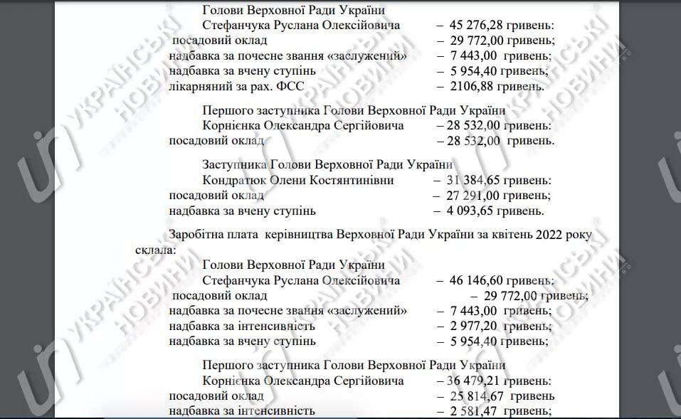 Также сообщается, что заработная плата главы ВР Руслана Стефанчука за 3 месяца работы с февраля по апрель составила 135 тысяч гривен, его первого заместителя Александра Корниенко - 94 тысяч гривен, а заместителя председателя Елены Кондратюк – 96 тысяч гривен.
