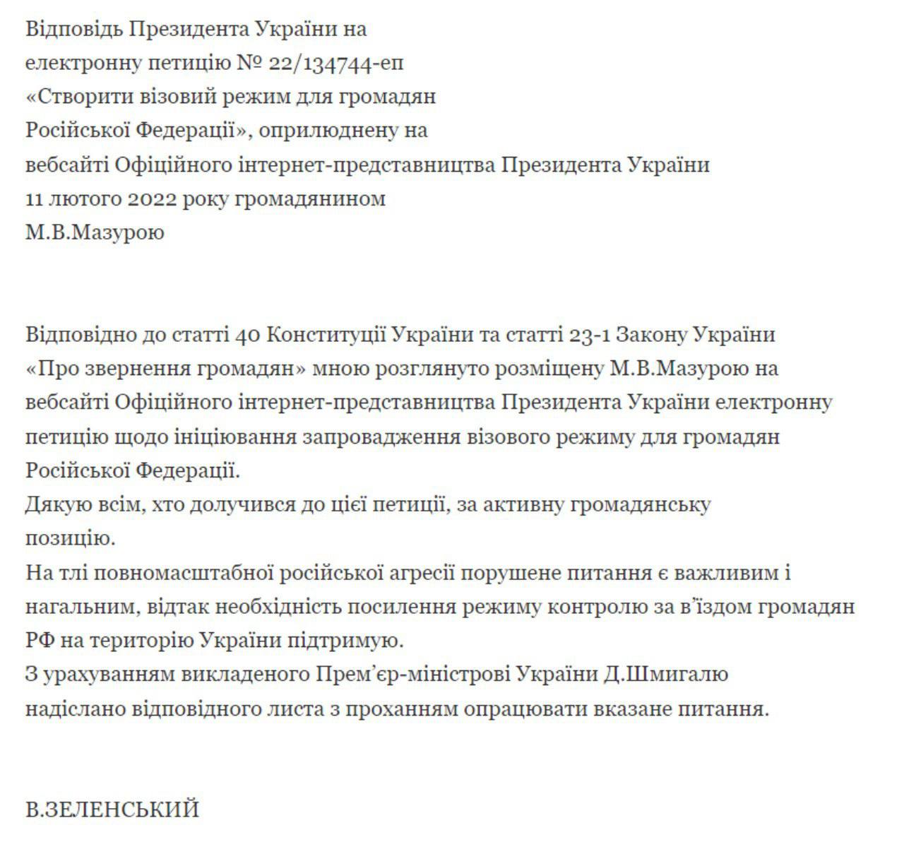 Как писала "Страна", петицию "Создать визовый режим для граждан Российской Федерации" на сайте президента обнародовали 11 февраля 2022 года. Инициатором указан гражданин Никита Мазура. Петиция набрала около 27 тысяч голосов. Указано, что Зеленский ее "успешно поддержал".