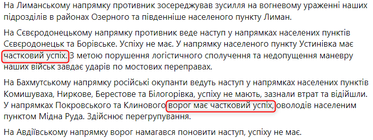 Одновременно в сводках Генштаба участились признания "частичного успеха" россиян при штурме украинских населенных пунктов. Хотя раньше тему территориальных потерь Генштаб старался дипломатично обходить, просто не упоминая захваченные противником города.