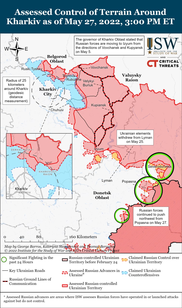 Также по данным экспертов организации, российские войска в Попасной стремятся продвигаться на север, чтобы поддержать окружение Северодонецка, а не на запад, в сторону Бахмута.