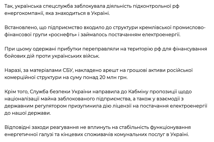 СБУ инициировала арест активов "Роснефти" в Украине. На основе материалов Службы безопасности Украины Шевченковским судом была заблокирована деятельность энергокомпании, входившей в группу "Роснефть". На ее денежные активы (более 20 миллионов гривен) наложен арест.