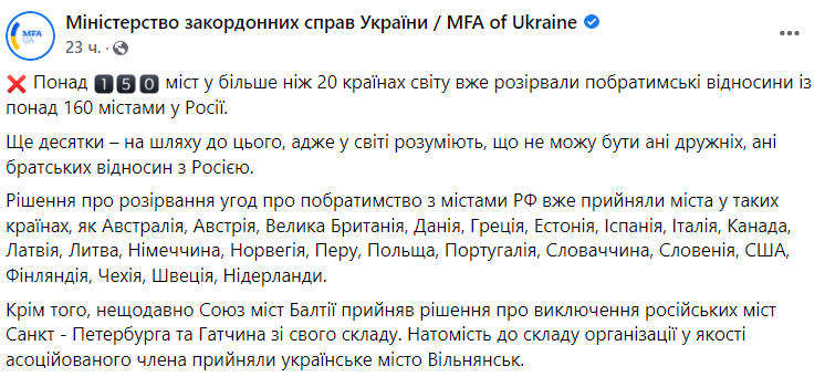 Более 150 городов мира расторгли побратимские соглашения с городами России после полномасштабного вторжения в Украину.
