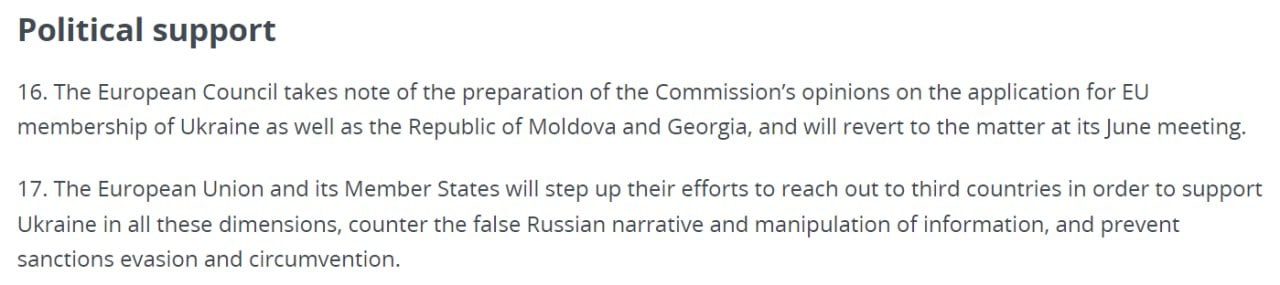 "Европейский совет принимает к сведению подготовку заключений Комиссии по заявке на членство в ЕС Украины, а также Республики Молдова и Грузии и вернется к этому вопросу на своем июньском заседании", - говорится в сообщении.