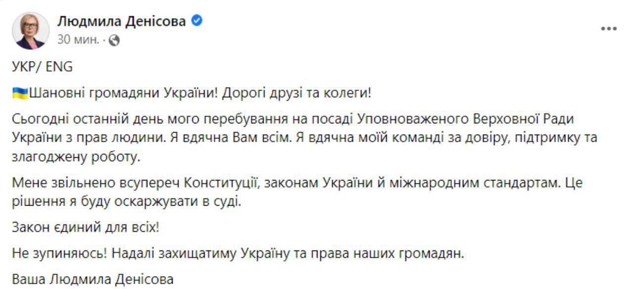19.22 Экс-омбудсмен Людмила Денисова заявила, что обжалует в суде свое сегодняшнее увольнение. Денисова считает, что ее уволили с нарушением Конституции.