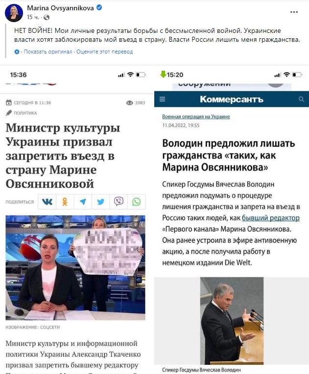 "Мои личные результаты борьбы с бессмысленной войной. Украинские власти хотят заблокировать мой въезд в страну. Власти России лишить меня гражданства", - написала журналистка.